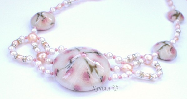 Полимерная глина ("живописная лепка"), нат. жемчуг 2-х оттенков, стразы Сваровски, бисер. В комплекте ещё браслет и серьги.