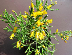 Цветки появляются из верхушечных ареол каждого концевого побега в конце зимы. Они колокольчатые, длиной 1 см, желтой, оранжевой или лососевой окраски. После цветения на их месте завязываются круглые, очень маленькие, зеленовато-белые плоды. |