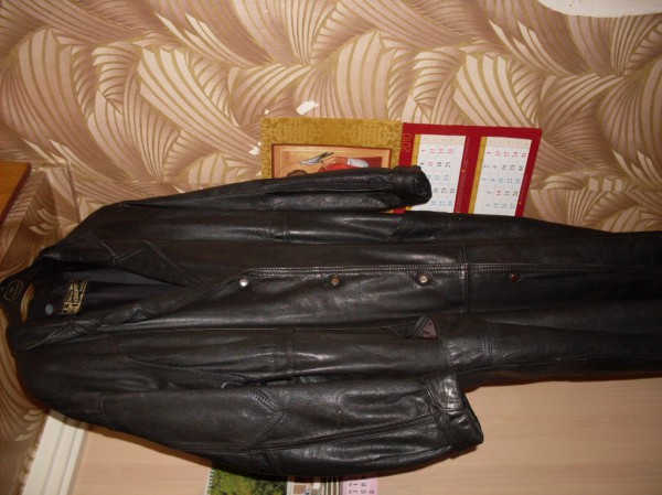 | Чёрный плащ из натуральной кожи. Размер подойдёт на 44-48, наверное. Хороший без завалов и косяков, из качественной натуральной кожи, просто модель ООоочень устаревшая. Идеален для бабушек, непродуваемый и скромненький. Можно для дачи. |