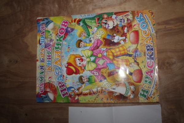 книга большая развивалка с разукрашкои.два листа в середине раскрашено.