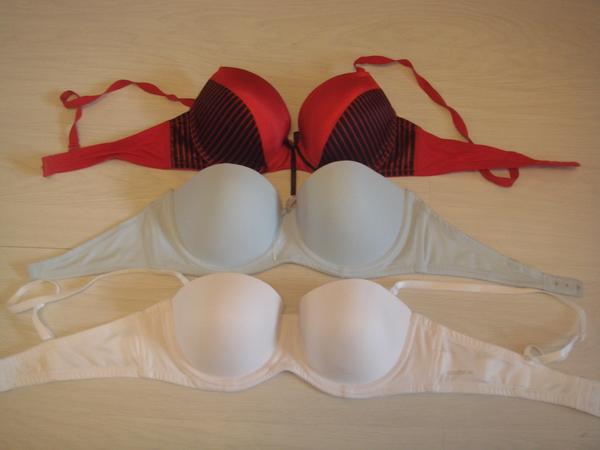 Белый и красный- не носила ни разу, голубой- два раза одет. Красный с пуш-апом. Белый- прекрасного качества балконет, силикон на лямках в два ряда