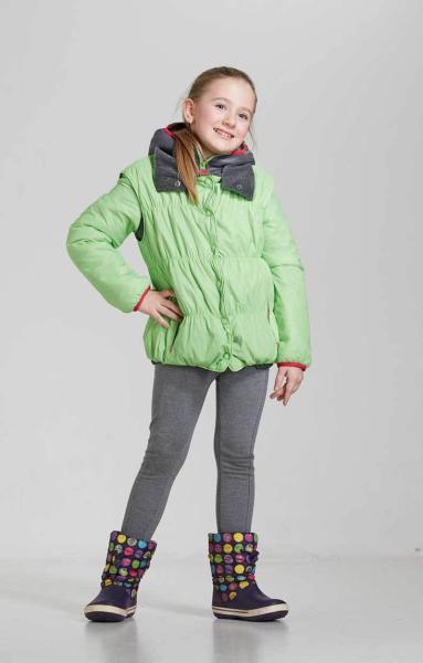Внутренняя куртка серого цвета с салатовыми рукавами. Застегивается на салатовую молнию. Есть капюшон. Внешний жилет на плюше. Застегивается на кнопки. Высокий воротник |