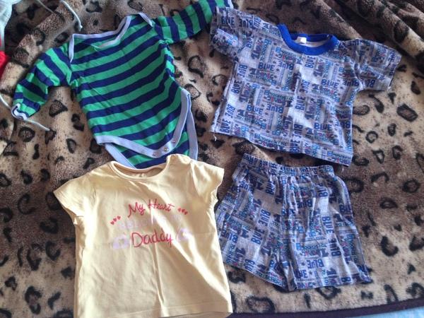 Боди на 3-6 мес, остальное до 1-1.5 лет.