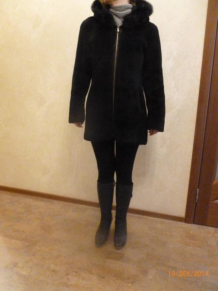 Шуба мутоновая чёрная с капюшоном. Песец на капюшоне. Застёгивается на молнию.