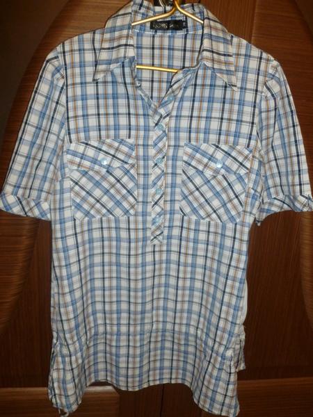 | При покупке ошиблась с размером. Голубая рубашка новая, бежевая 1 раз б/у, абсолютно одинаковые, только разного цвета. Застёгиваются сбоку на замочек, впереди пуговки, по бёдрам стягивается кулиской. Хлопок 100%. Обе постираны сразу как купила. |