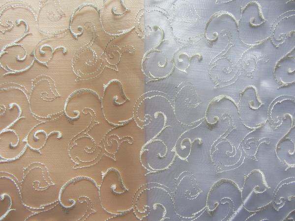 Органза с вышивкой, лежит на кремовом и белом фоне. Такую ткань можно (например) использовать при пошиве НГ костюма для девочки. Также смотри 2 следующих фото. |