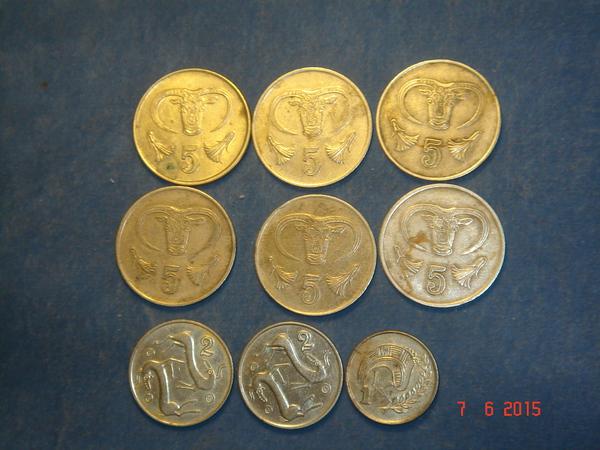 Кипр: 1. 5 фунтов 1994, 92, 90, 88, 88, 85 гг. 2. 2 цента 1992, 94 гг.