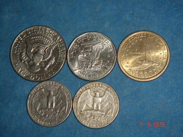 1. 1 доллар Сьюзен Энтони 1999 г. 2. 1 доллар Сакагавеи 2000 г. 3. Полдоллара 1984 г. 4. Четверть доллара 1971 г. 5. Четверть доллара 1973 г