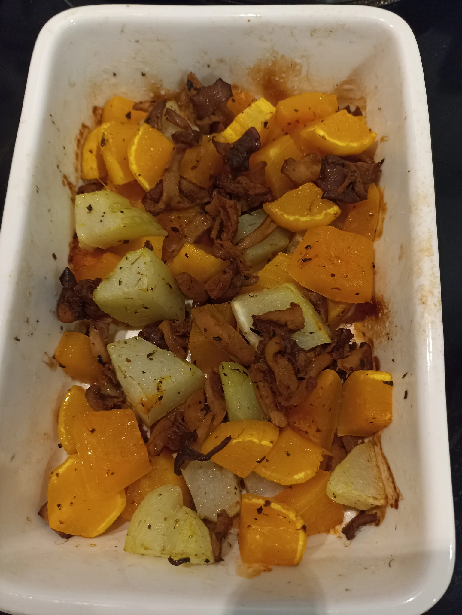 Просто тыква, чайот, специи, масло растительное. Это тыква почему-то вид апельсина приобрела.