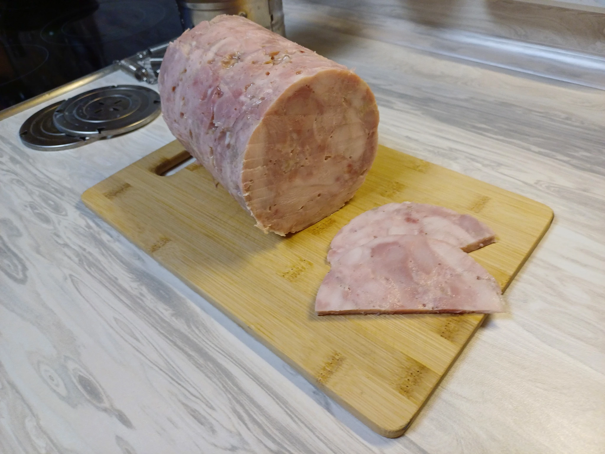 В ветчиннице, впервые. Без желатина, только с посолочной смесью и специями. Из филе бедра, филе грудки и фарша свиного.
