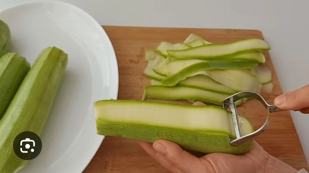 Девушка в рецепте порезала кабачки на 4 части, удалила сердцевину, а дальше покрошила длинными брусочками кабачок. Я же решила сделать тонкие, как на спагетти. Овощечисткой наделала тонкие слайсы(фото приложила). На вкус блюда не думаю, что это сильно повлияло. Просто мне так захотелось