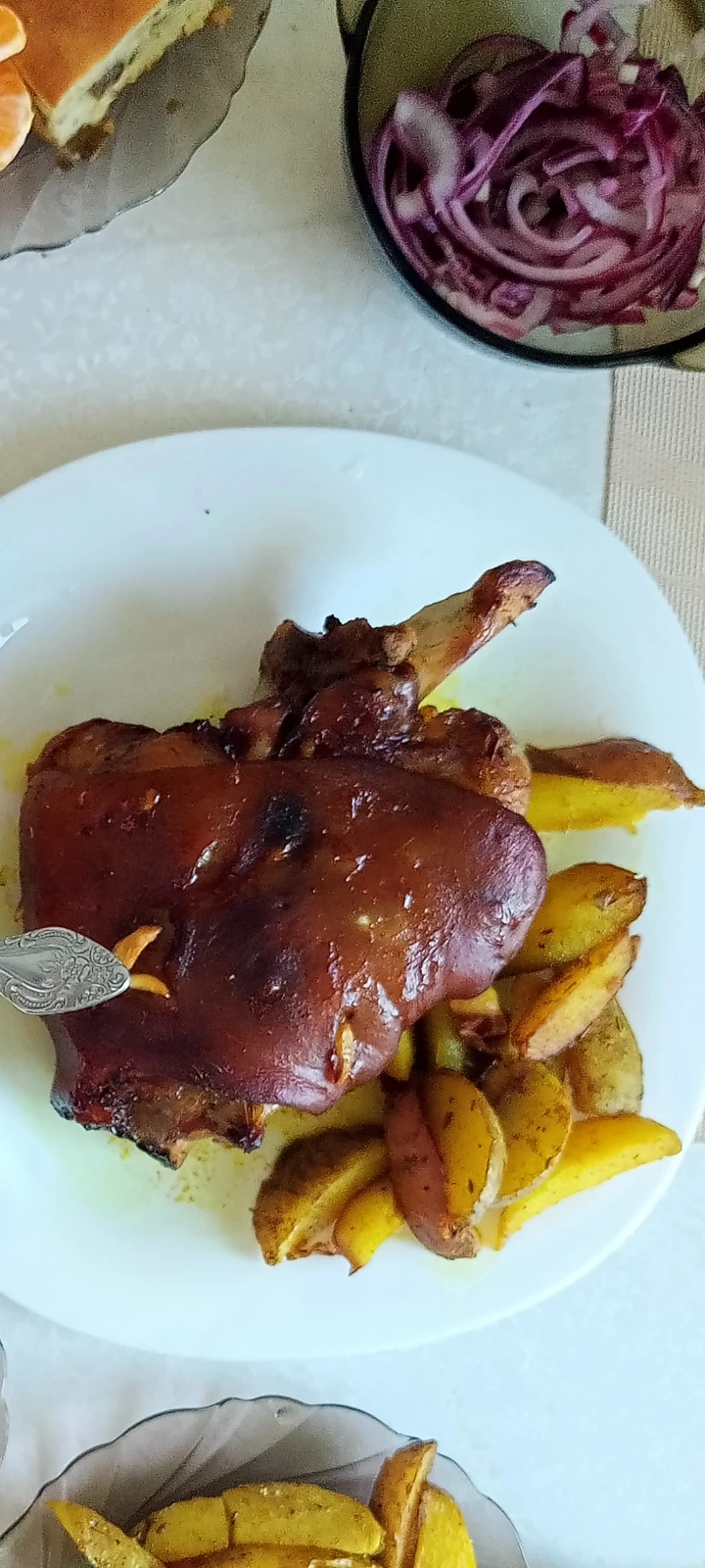 Рулька по мюнхенски в пиве . Единственное , рульку перед запеканием час отвариваю в пиве со специями - часть жира уходит, а потом шпигую чесноком и в духовку . На гарнир картофель по деревенски, разносолы . Салат из курицы с ананасами и второй салат греческий .