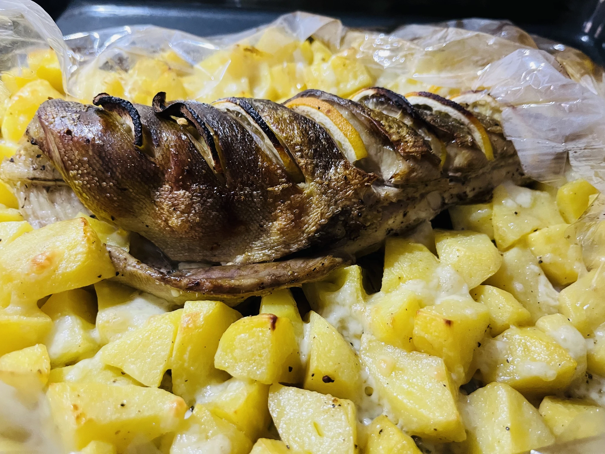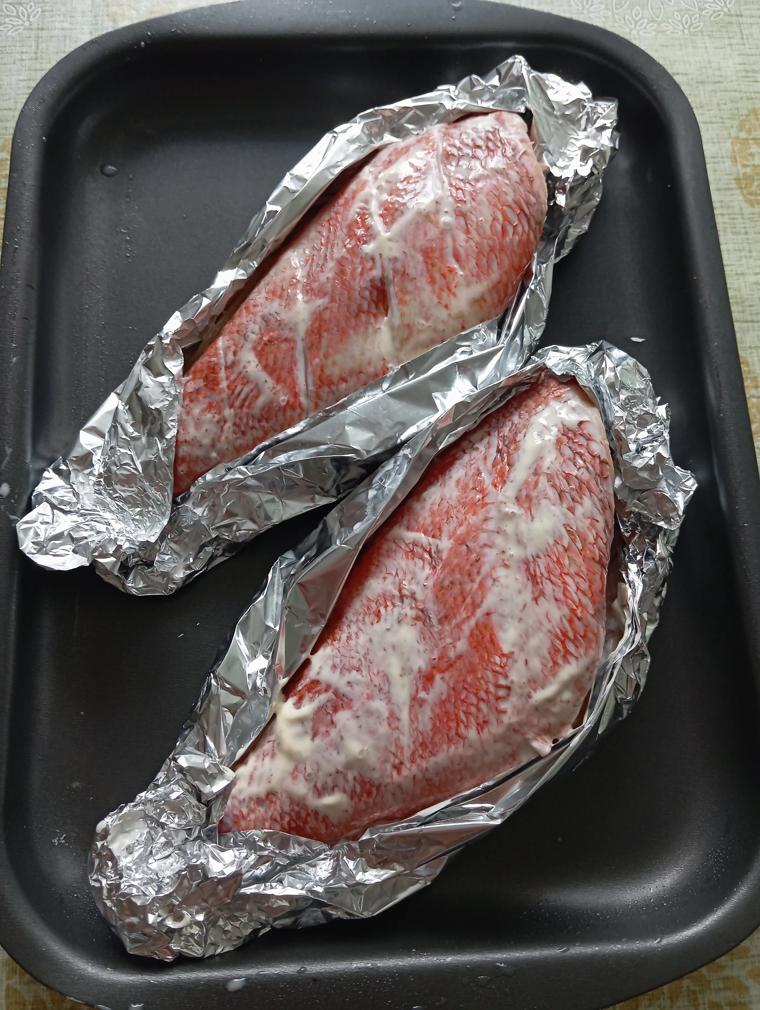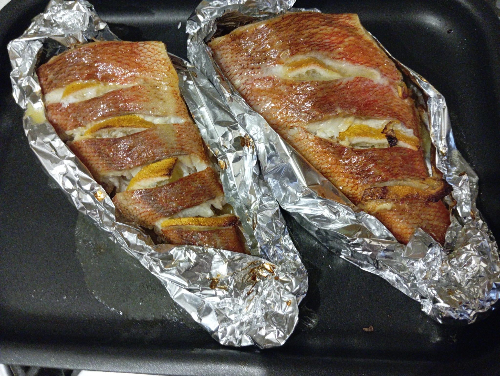На ужин морской окунь, запеченный в фольге в духовке, с рисом.