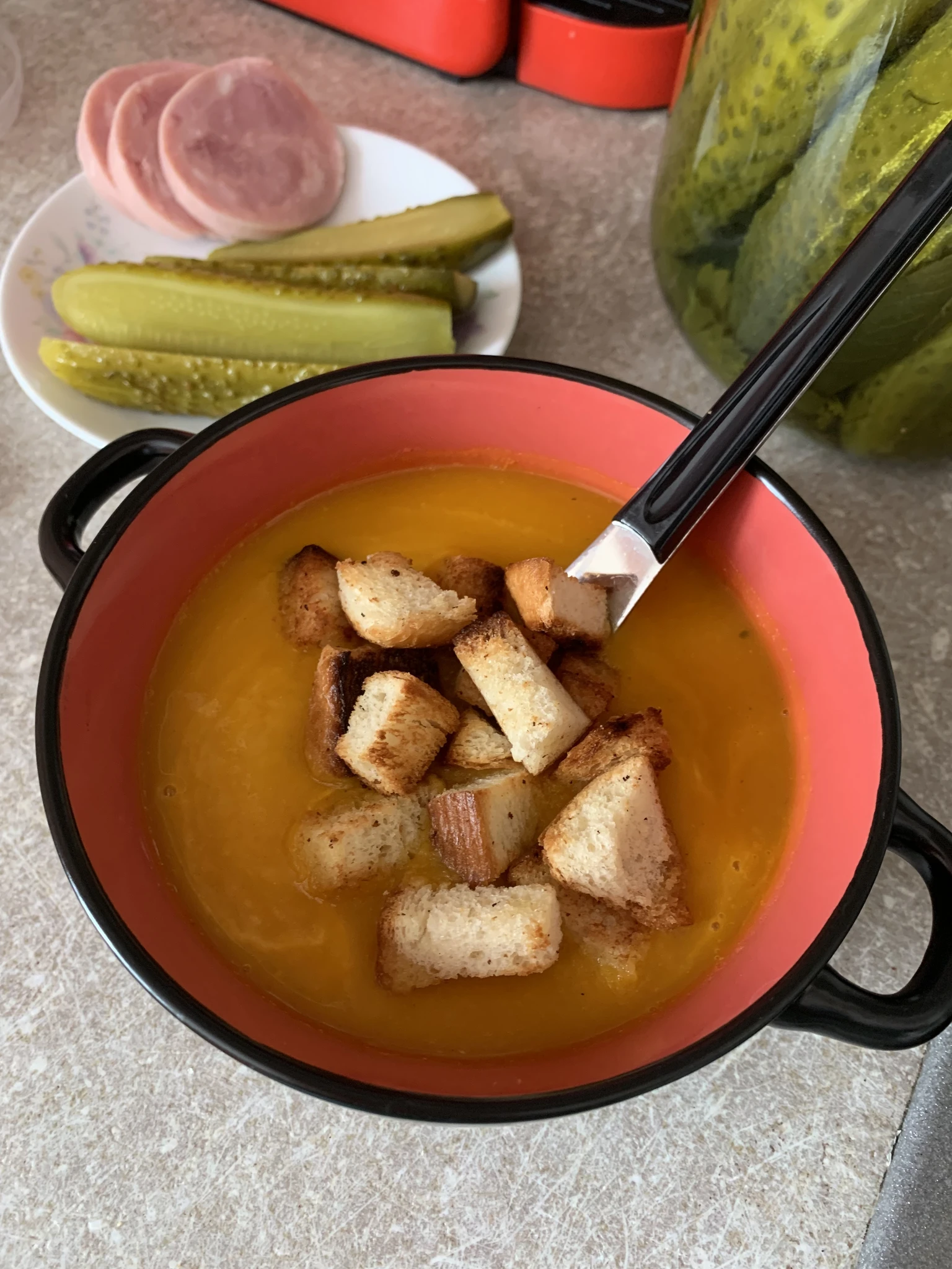 На обед был суп-пюре из тыквы с курицей. На ужин просто блинов сейчас потрескаем и все )) Ничего больше не хочется что-то))