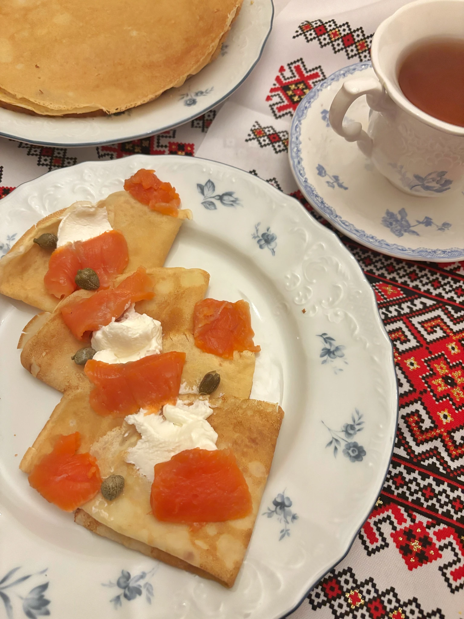Ну понеслась ) масленичная неделя . Блины с творожным сыром , неркой и каперсами . За кадром сметана и помакушка из масла с яйцом