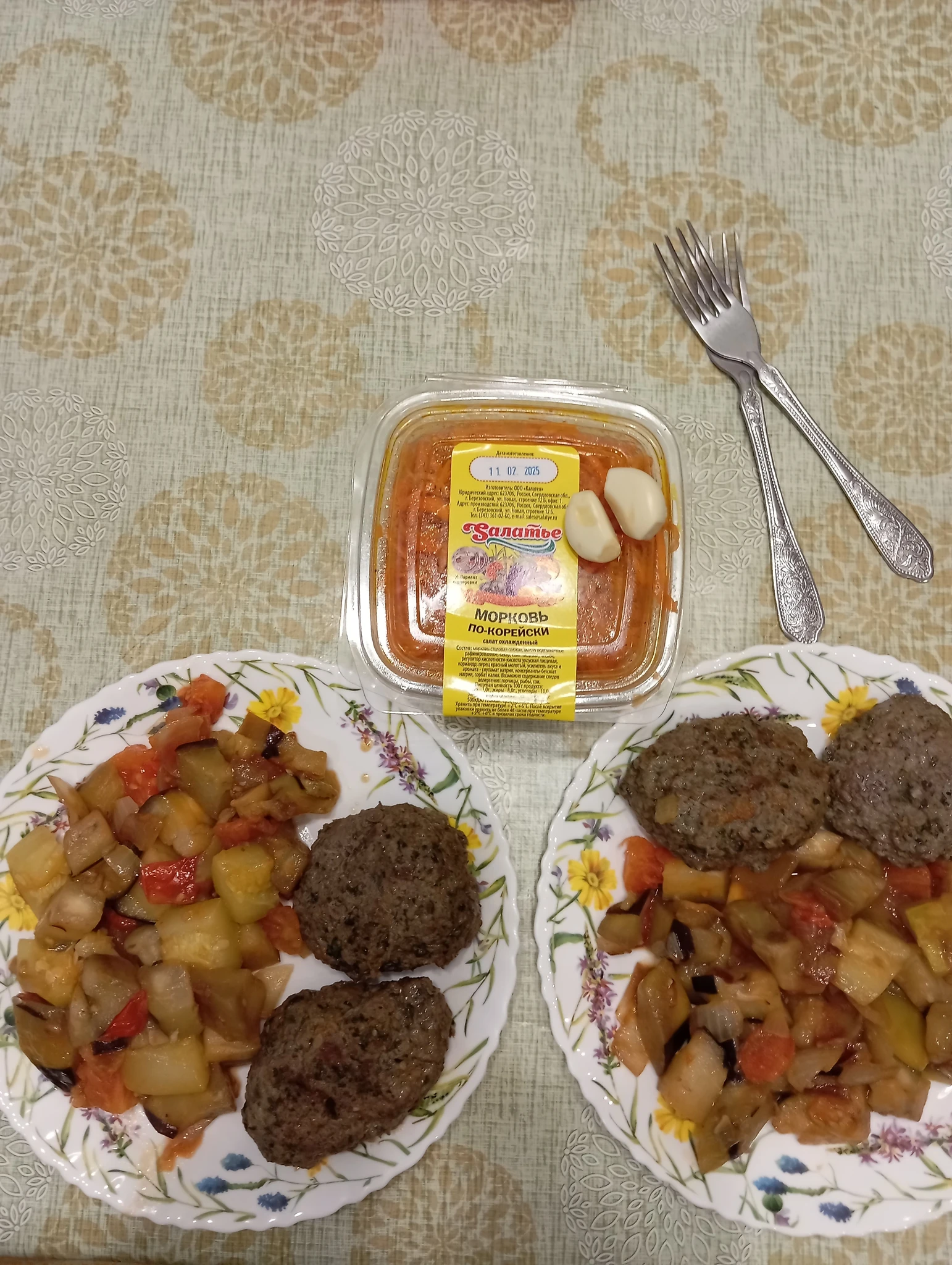 Котлеты, баклажаны, покупная корейская морковь, по дольке чеснока для профилактики