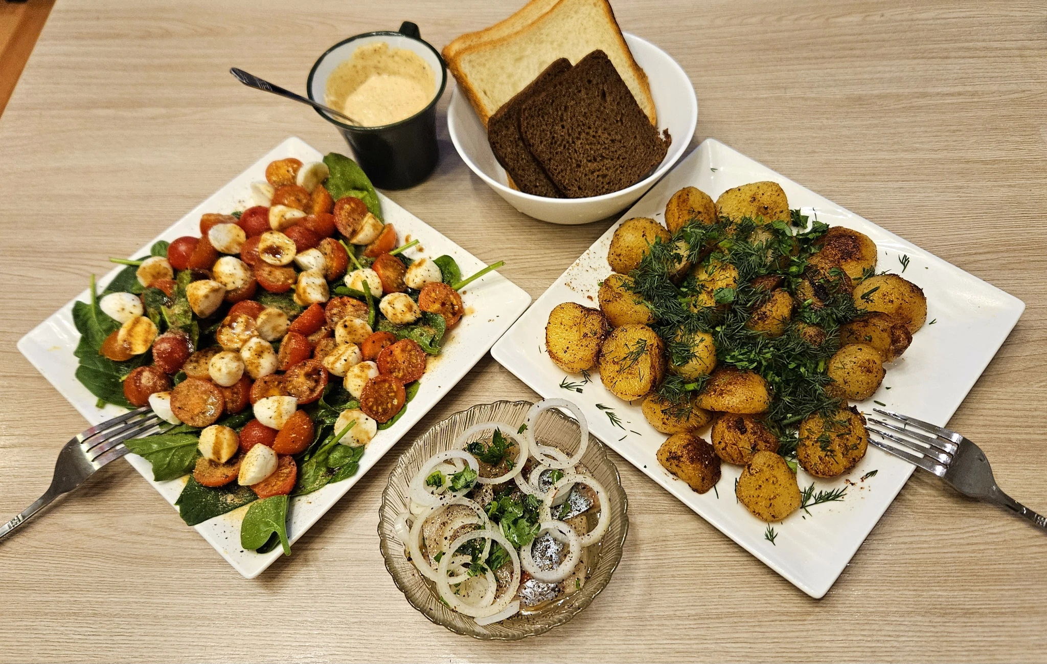 Отварной, затем обжаренный на сливочном масле картофель; мне — с маринованной с вялеными томатами сельдью, сыну — сосиски; салат «аля Капрезе» (помидоры черри, моцарелла, шпинат и различные заправки и специи).