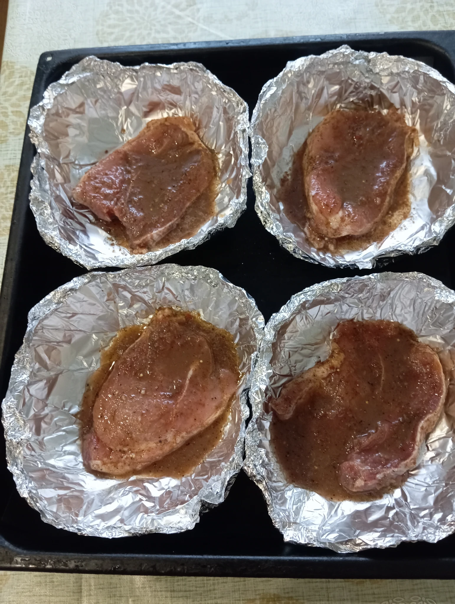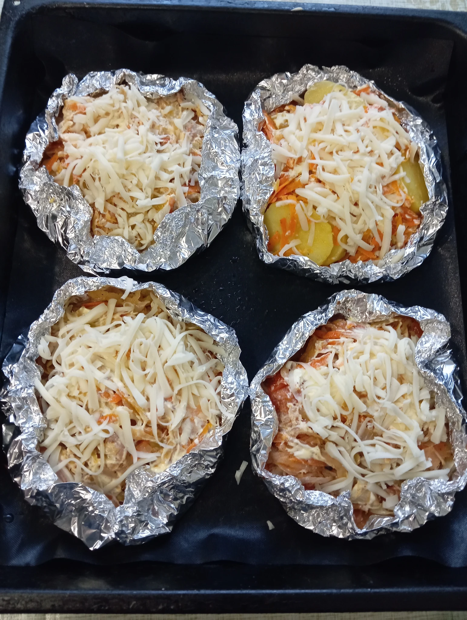 Будет свинина в фольге, сверху овощи. Одна порция с картошкой (подваренная) , вторая - картошка и тушеная капуста (муж любит сложный гарнир) и две порции - тушёной капустой