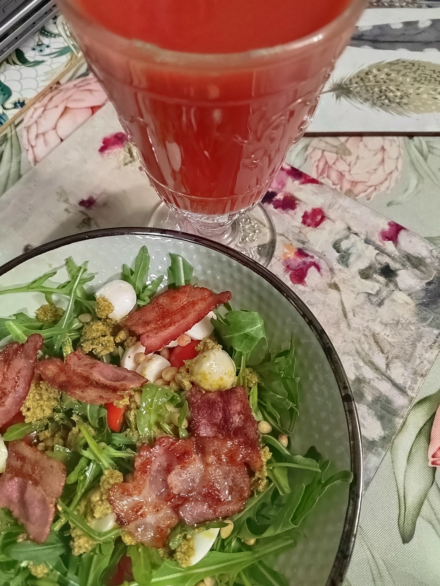 Салат с беконом, моцареллой, черри, кедровыми орешками и томатный сок