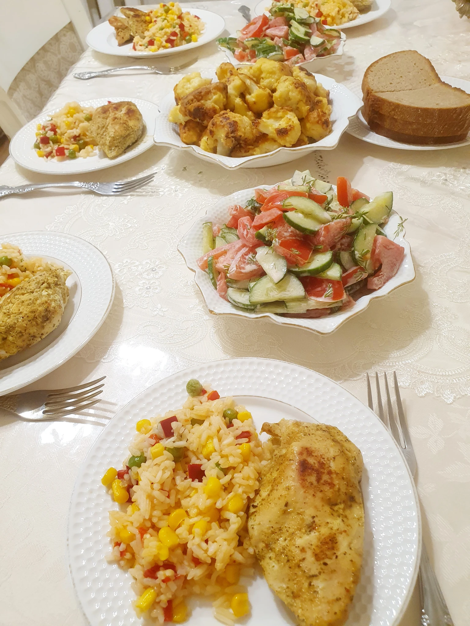 У нас сегодня быстроужин. Гавайский рис с куриным филе. Салатик и жареная цветная капуста.