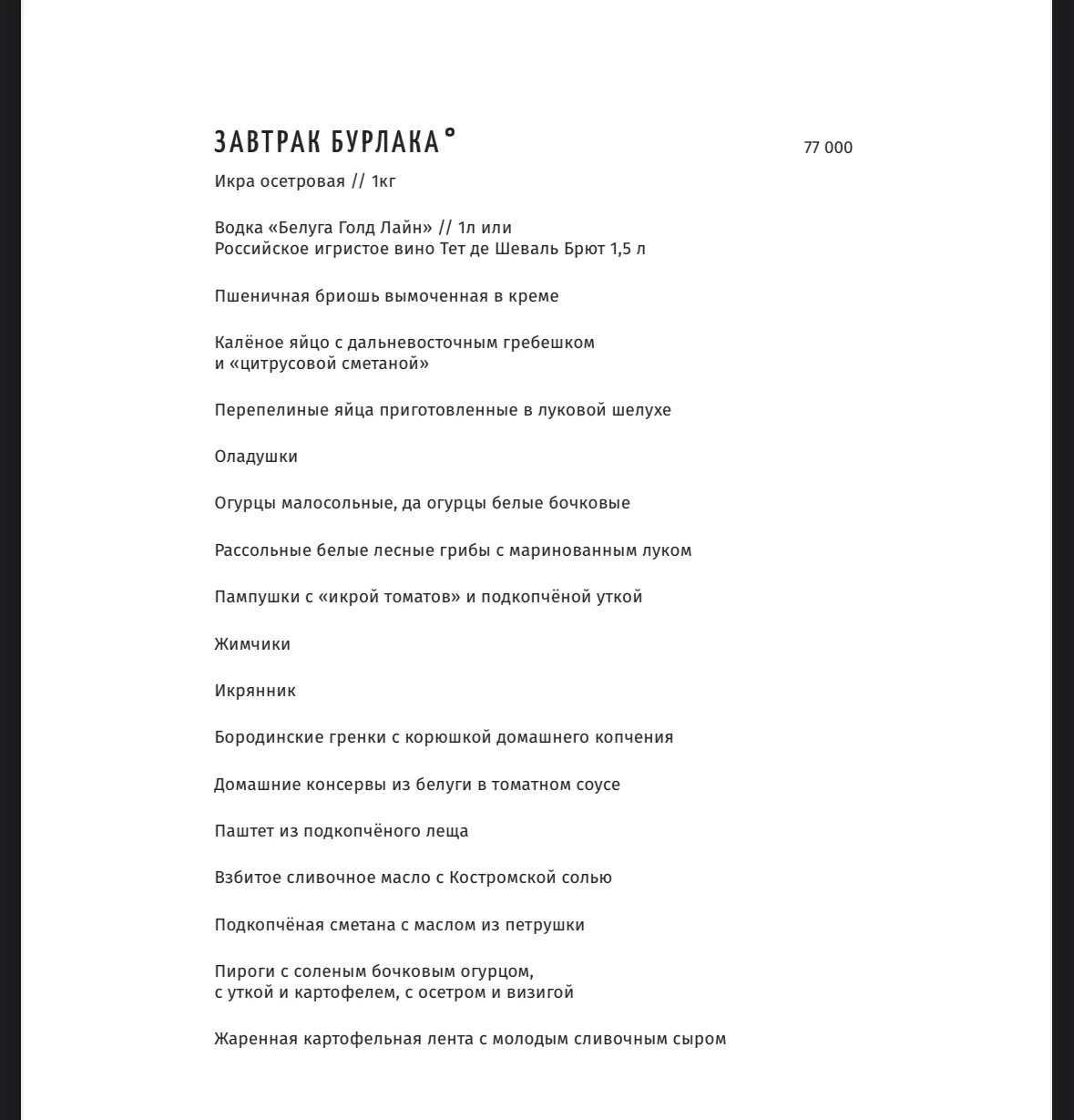 Завтрак бурлака за 77000. А яства то какие: 1 кг черной икры и литр водки
