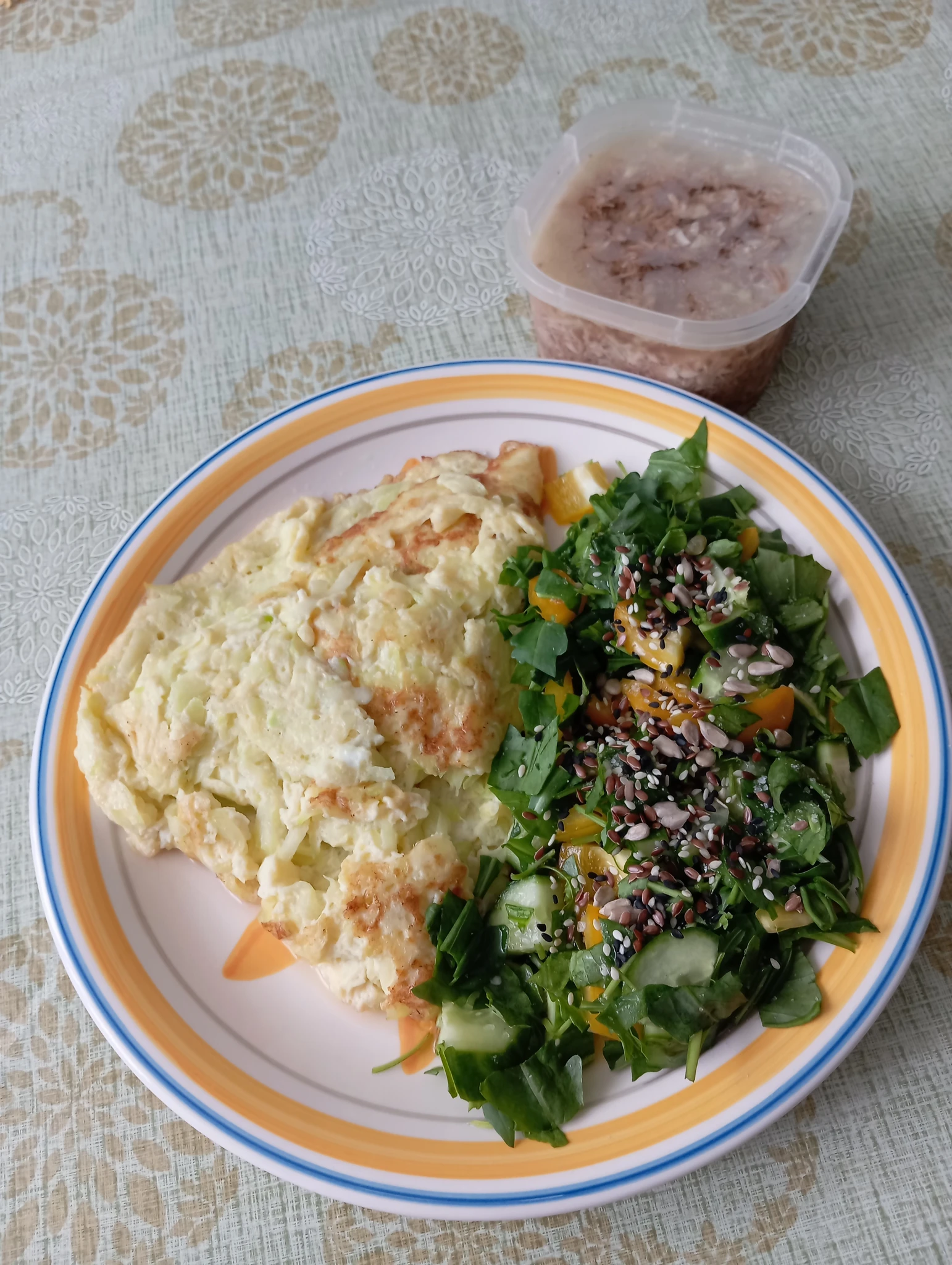 Омлет с кабачком, овощи, заливное из индюшачих шей