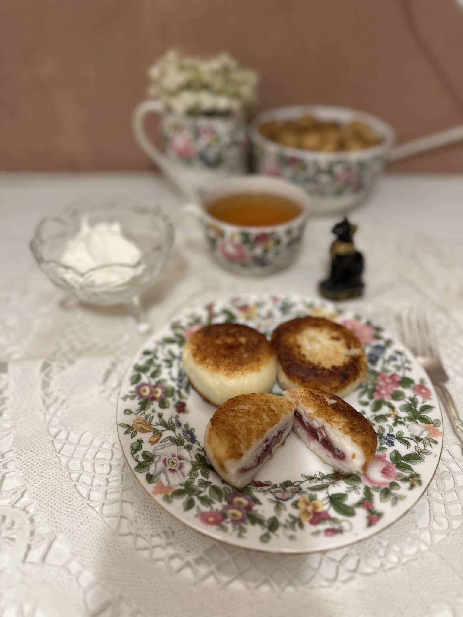 Одиноковые сырнички с малиновой начинкой со сметаной.