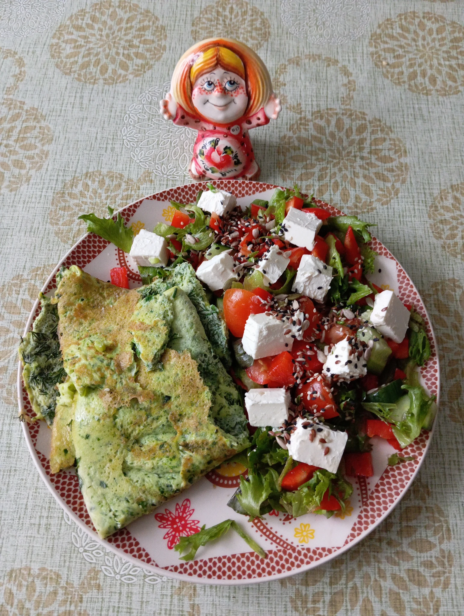 Сегодня остатки шпината измельчила в блендере, туда яйца, вкуснее омлетик получился, овощи, всё как всегда.