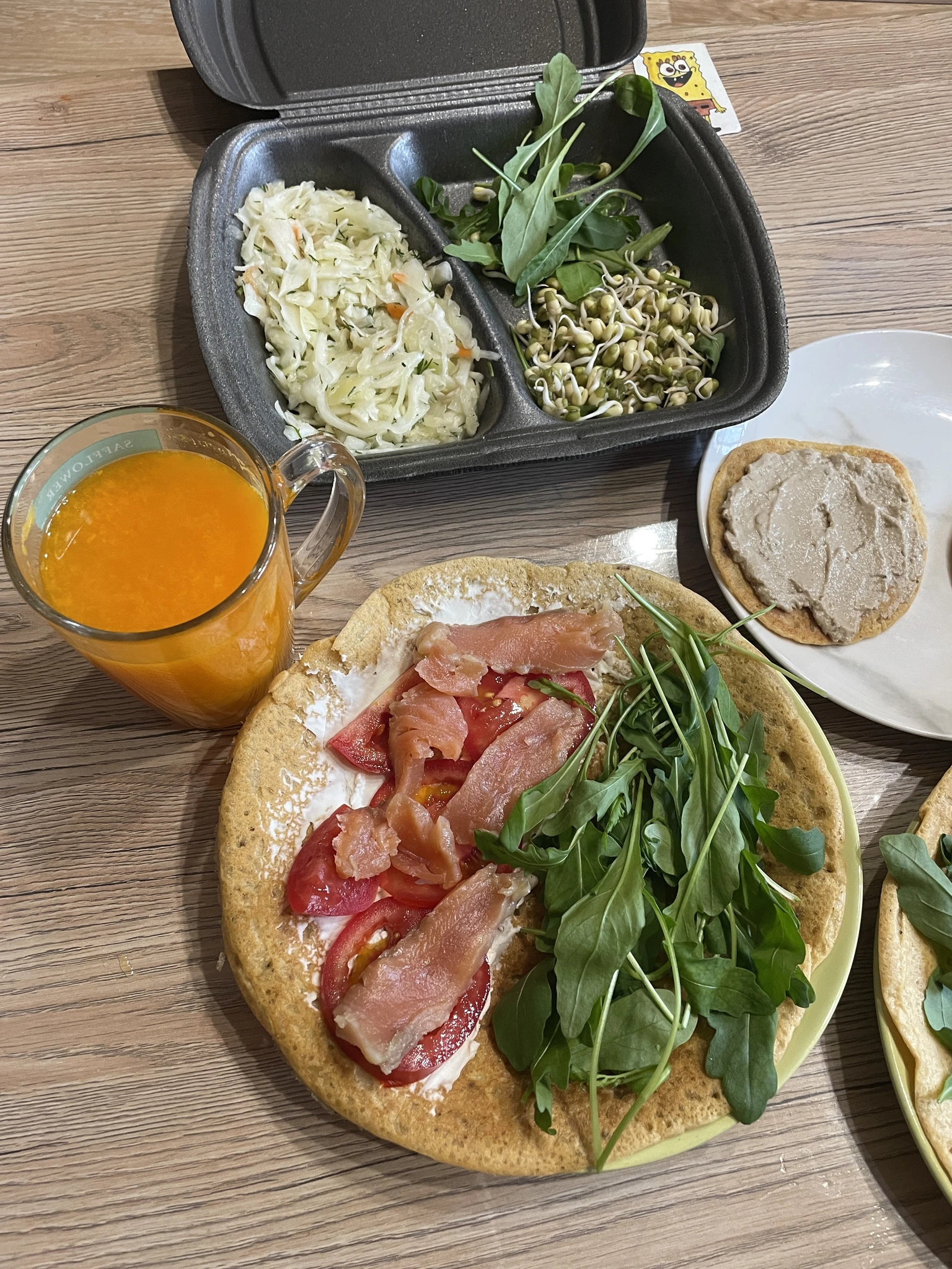 Чечевичные лепешки, паштет из печени трески, кижуч, такой себе