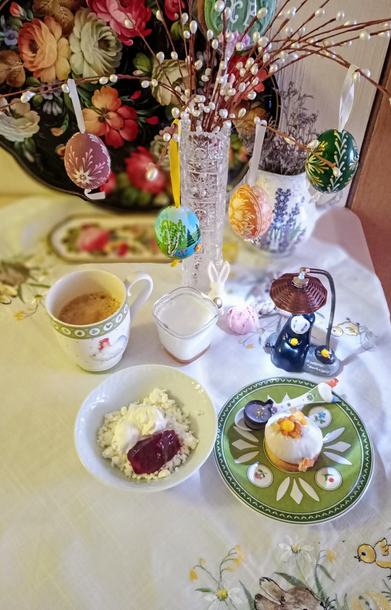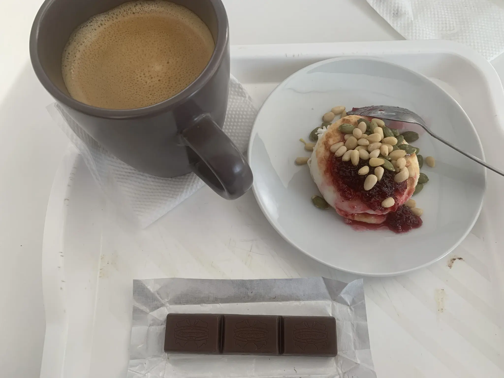 Творог с нытвенской сметаной и мармеладом из красной смородины, панакота с абрикосом, мини кекс-кулич с манго из Самоката, дубайская конфетка и черный кофе. Ну и дурак, само собой