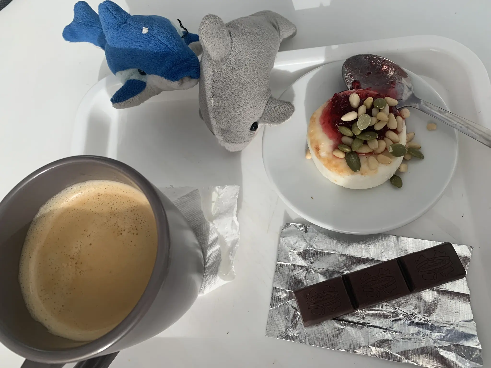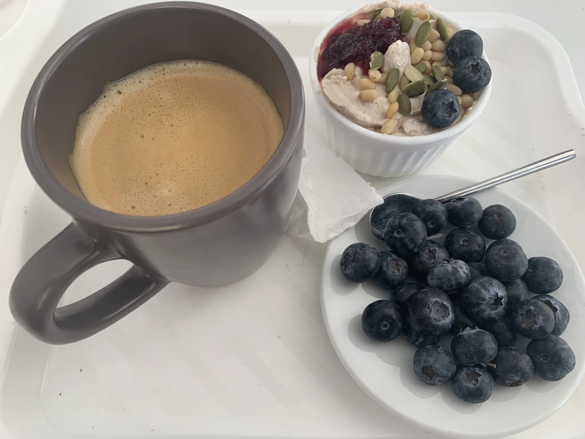 Десерт. Вчера дома сварганила, порция осталась, принесла себе на завтрак- взбила сливки, потом добавила творог и банан и ещё раз проблендернула.