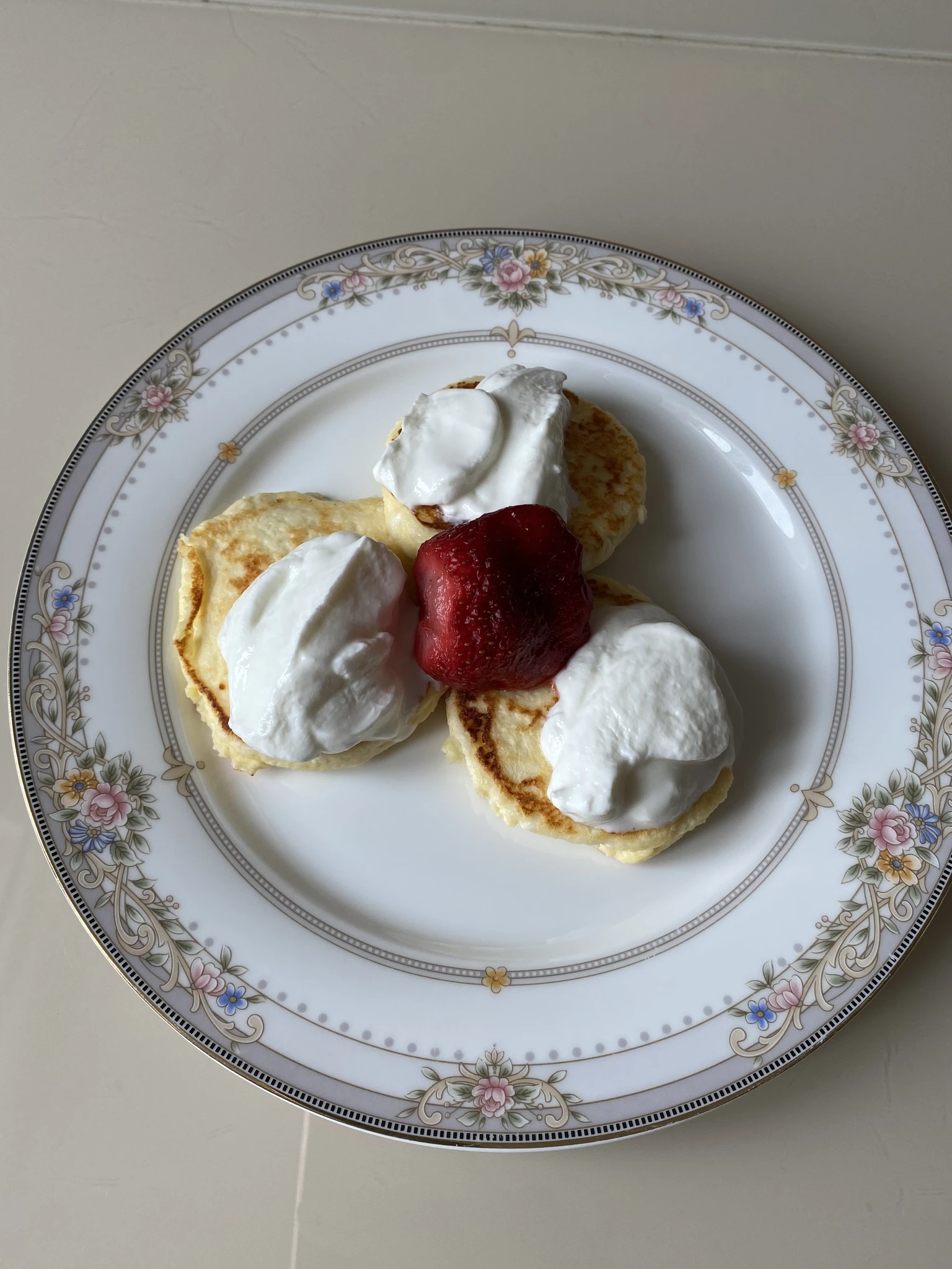 Сырники, греческий йогурт и клубничка, кофе еще