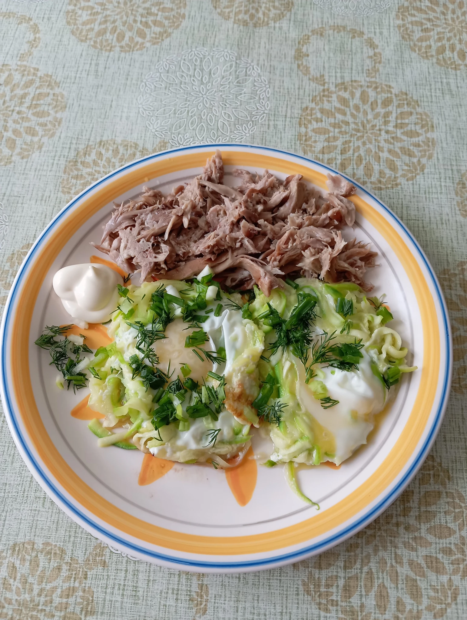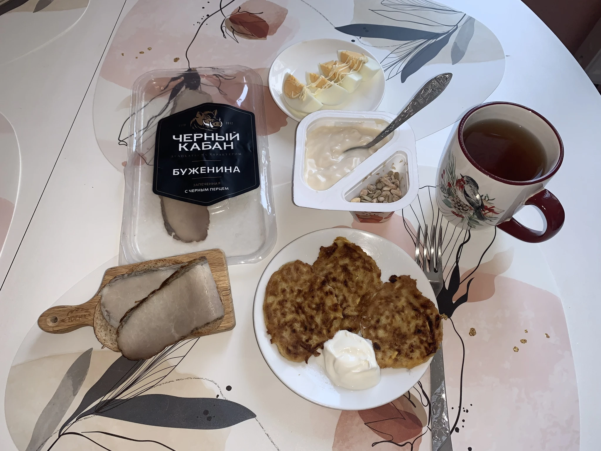 Доброе утро! Сегодня всего по-немногу. Оладьи кабачковые. Понравилась буженина чёрный кабан, второй раз покупаем.