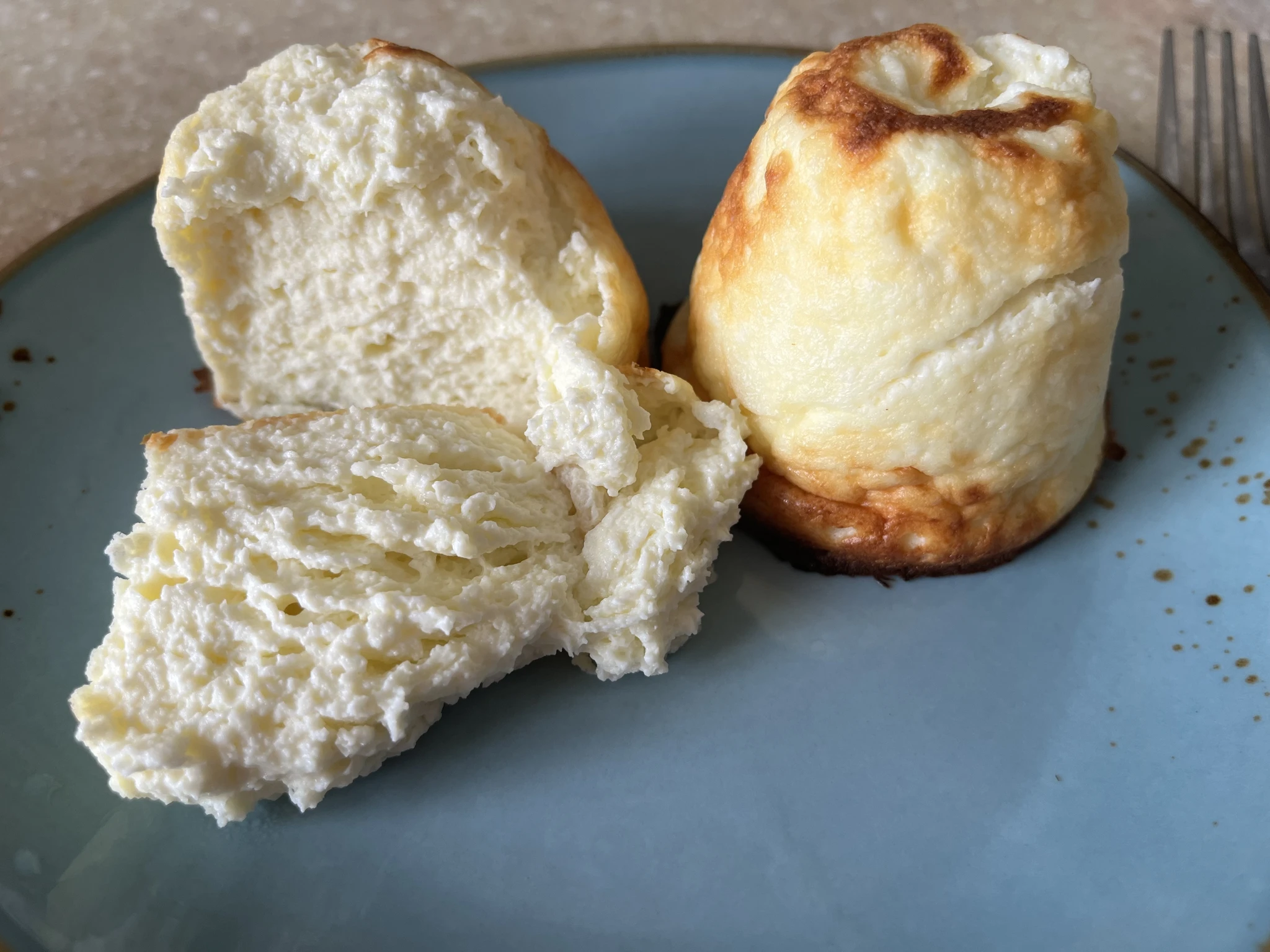 Сегодня решила суфле творожное сделать, сырники не умею. Творог, сахар, ваниль, кукурузный крахмал, яйцо- все блендером пробить, в формы для кексов. Очень вкусные, нежные.