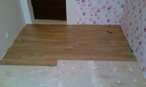 Сделали звукоизоляцию по всем стенам, обшили гипсокартоном. На полу плитка ПВХ, я о ней отдельную темку заводила.