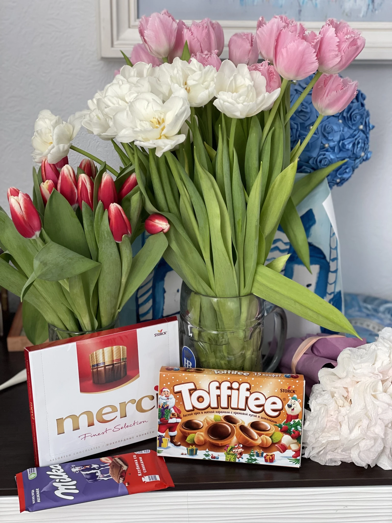 Муж подарил цветы и сделал завтрак, дети цветы и сладости подарили. Я довольна😍
