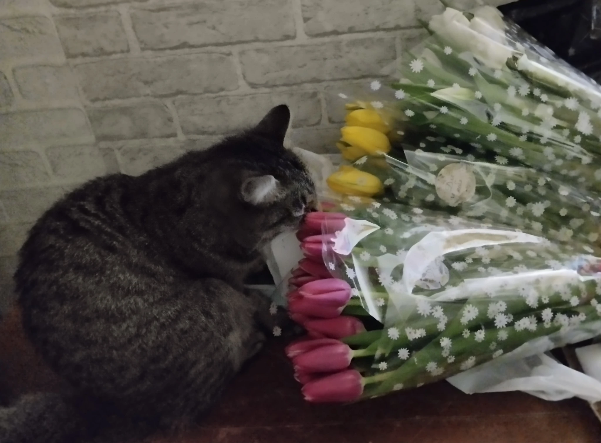 Всем сказала цветов не дарить, даже с работы не понесла домой. Цветов дома нет, кошь нещадно их уничтожает.