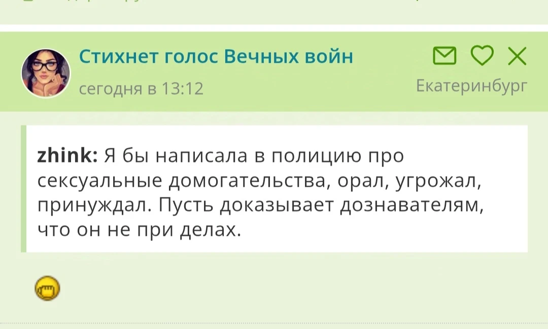 Каty7788: Автор,а это вы в соседней теме, писали, что обвинили бы орущего мужика в педофилии и сексуальном насилии?