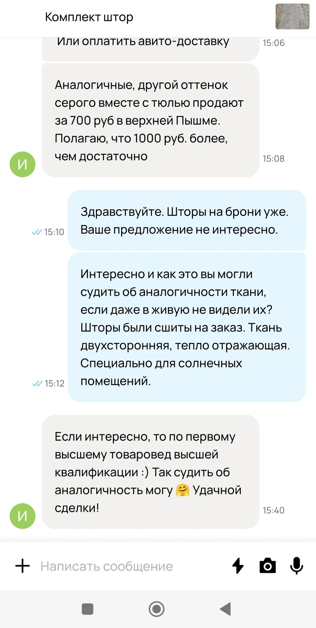 Женщина обосновала мне сразу почему оценивает мой товар ниже))) но на вопрос " Как она поняла качество ткани, она гордо ответила, что в прошлом товаровед высшей квалификации))) не поняла, как связана её профессия со шторами и как она смогла определить по фото, что за ткань. В итоге продала по своей цене другой покупательнице. Цена вопроса была 1500 руб.