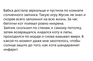 По поводу солнечных зайчиков. На стене висел ковёр, над ковром узор от когтей кошки почти до потолка - она бегала за зайчиками от фар. Участковая педиатр долго стеснялась спросить, что это на стене, когла спросила, долго смеялись - у них-то собака была, по стенам не бегала
