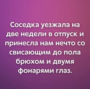 Племянница привела к родителям жениха и они решили остаться ночевать. Родители живут в большом доме и у них есть взрослая кошка мейн-кун с характером и размером сторожевой собаки. Днем она жениха не трогала. Когда перед сном все разошлись по комнатам, он пошел в душ на первый этаж. Ночью просыпается племянница, жениха нет, на телефоне море пропущенных вызовов и сообщений от него, звук отключен. Оказывается, когда жених стал выходить из душа, то под дверью его караулила кошка с агрессивным настроением, он постеснялся кричать, побоялся выходить, так и сидел там.