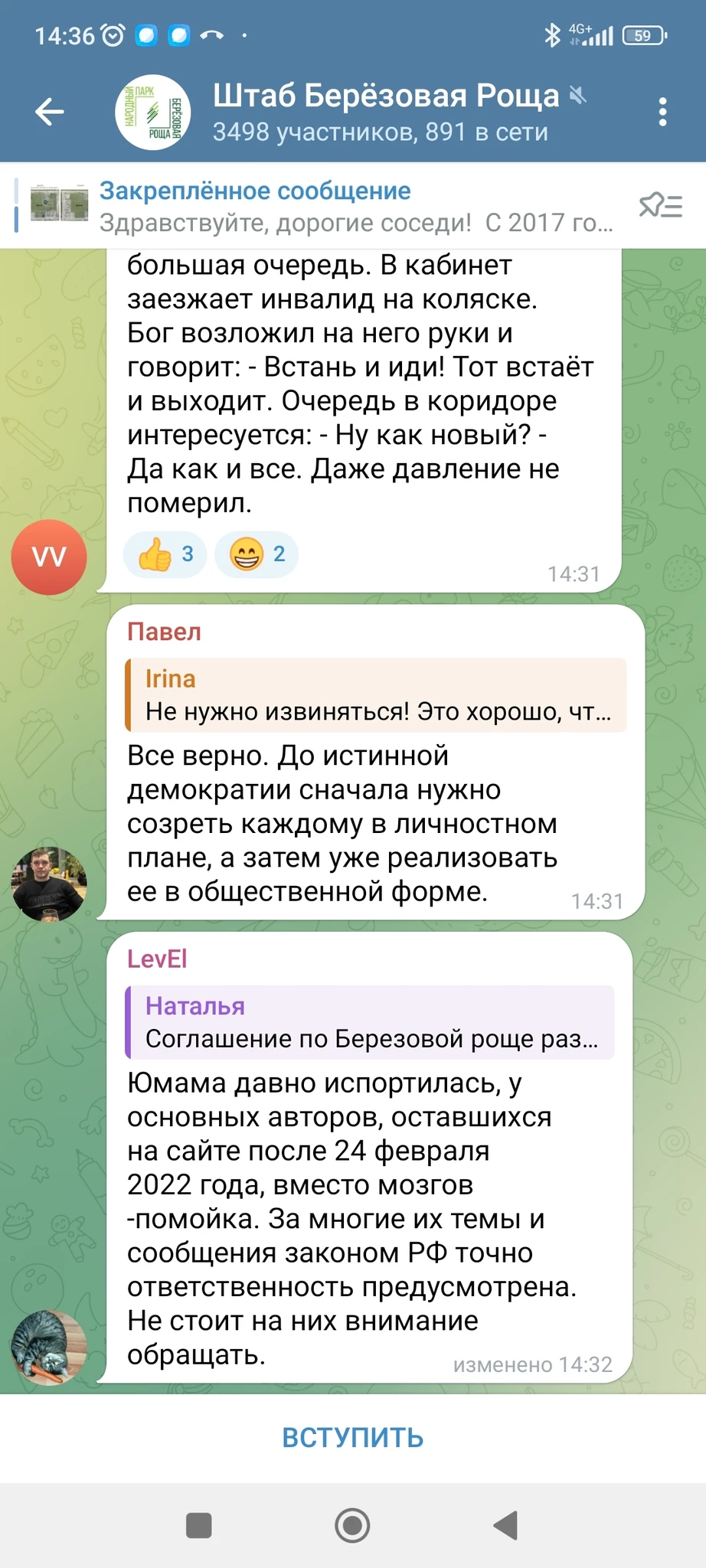 Кстати передайте Каракозу, что если он всех Чкаловцев забанил, а теперь пишет в чате, что ему кто-то звонил и говорил что мы все ЗА, то ему бы к психиатру обратиться, голоса в голове это плохой знак. Мы против и не дадим передать землю