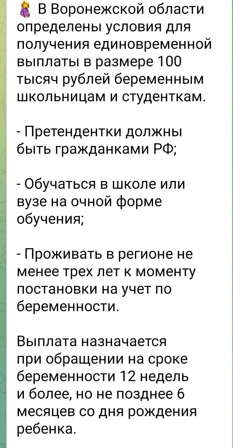С 1 января 2026 года размер единовременной выплаты беременным, обучающимся по очной форме, сократят с 200 до 100 тысяч рублей, говорится в приказе (https://publication.pravo.gov.ru/document/6301202510150014?index=3) регионального министерства социально-демографической и семейной политики.