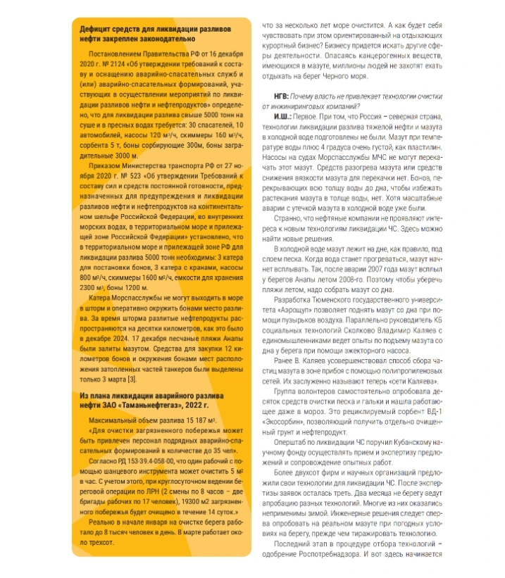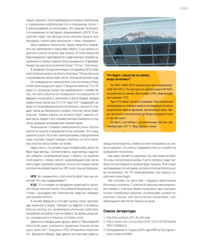 Так чтобы испарить мазут, надо его нагреть до 400гр. Даже в жаркое Анапское лето это невозможно. Мое мнение что воздух там без изменений. И чище того же Екатеринбурга и любого промышленного города с трубами. Никто мазут там не жжет. Да песок и грунт загрязнен, страдают животные и растения морей, потому что мазут облепляет, не дает "дышать", животные заглатывают кусочки мазута и травятся. Но ни в воде ни в воздухе он не растворяется. Поэтому вода (грунтовые, да и морские вне мазутных взвесей) и воздух чистые, в это верю, как химик. Отдыхать нельзя из-за того что пляжи и грунт на пляжах загрязнен, просто грязно.