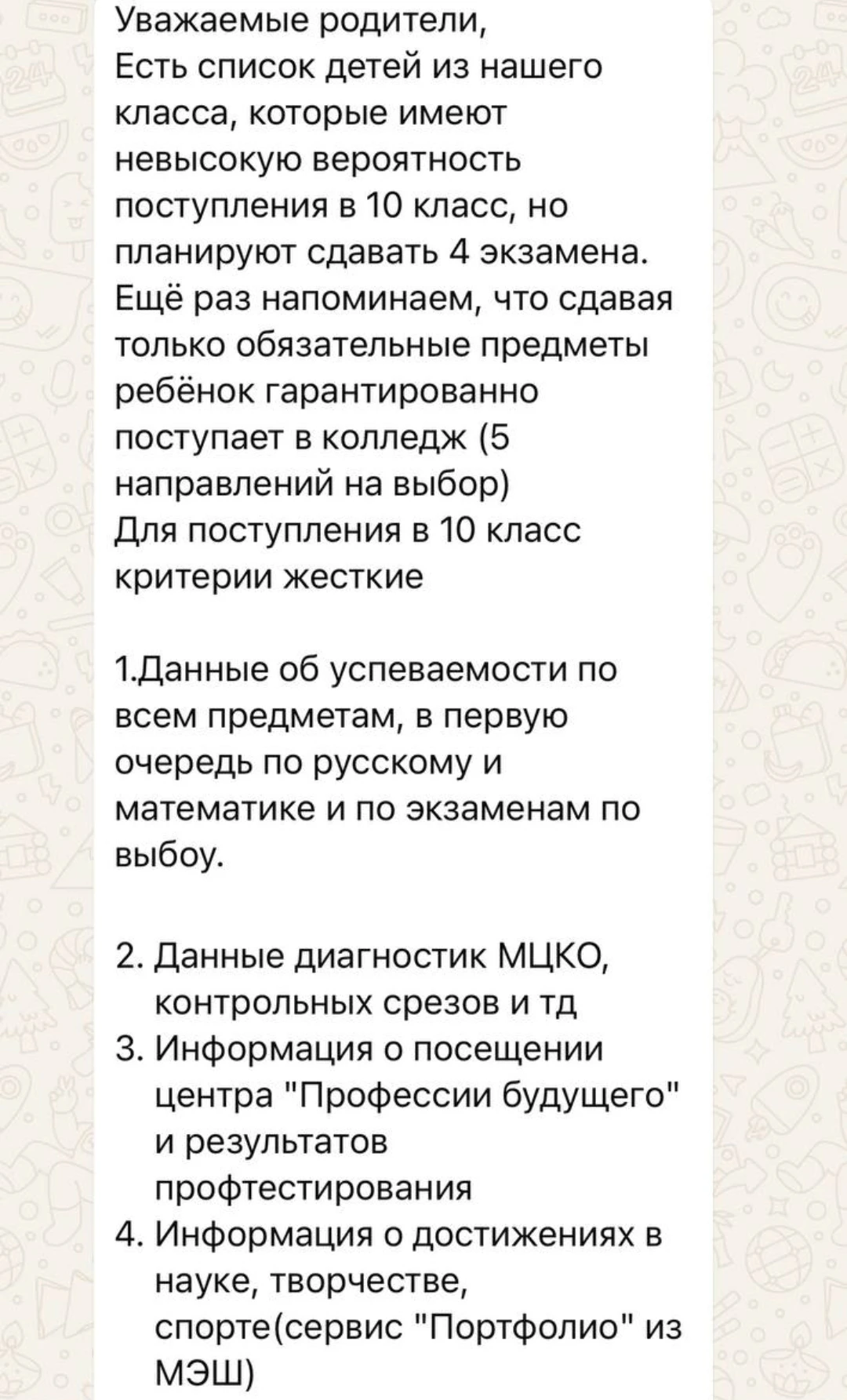 Была на собрании родительском на днях. Сказали, что собираются снижать сумму установочных баллов на огэ , речь шла про математику. То есть если раньше 8 баллов было на тройку, то сейчас получи 6 баллов и ты свободен, как Добби. Сдал только два экзамена и иди без возможности возврата в 9 класс. Так же идут разговоры об отмене через два года классного руководства.