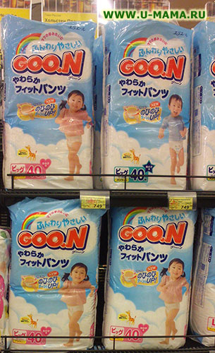 - Подгузники GOON, цена 749 руб. за большую пачку.