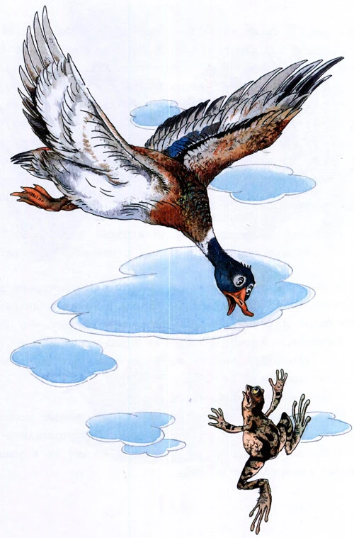 Я от смеха чуть кофе не пролила! Больше всего этот зажигательный номер подходит для сказки Лягушка-путешественница. Там, где лягушка уговорила уток взять ее с собой в полет и сорвалась из-за хвастовства