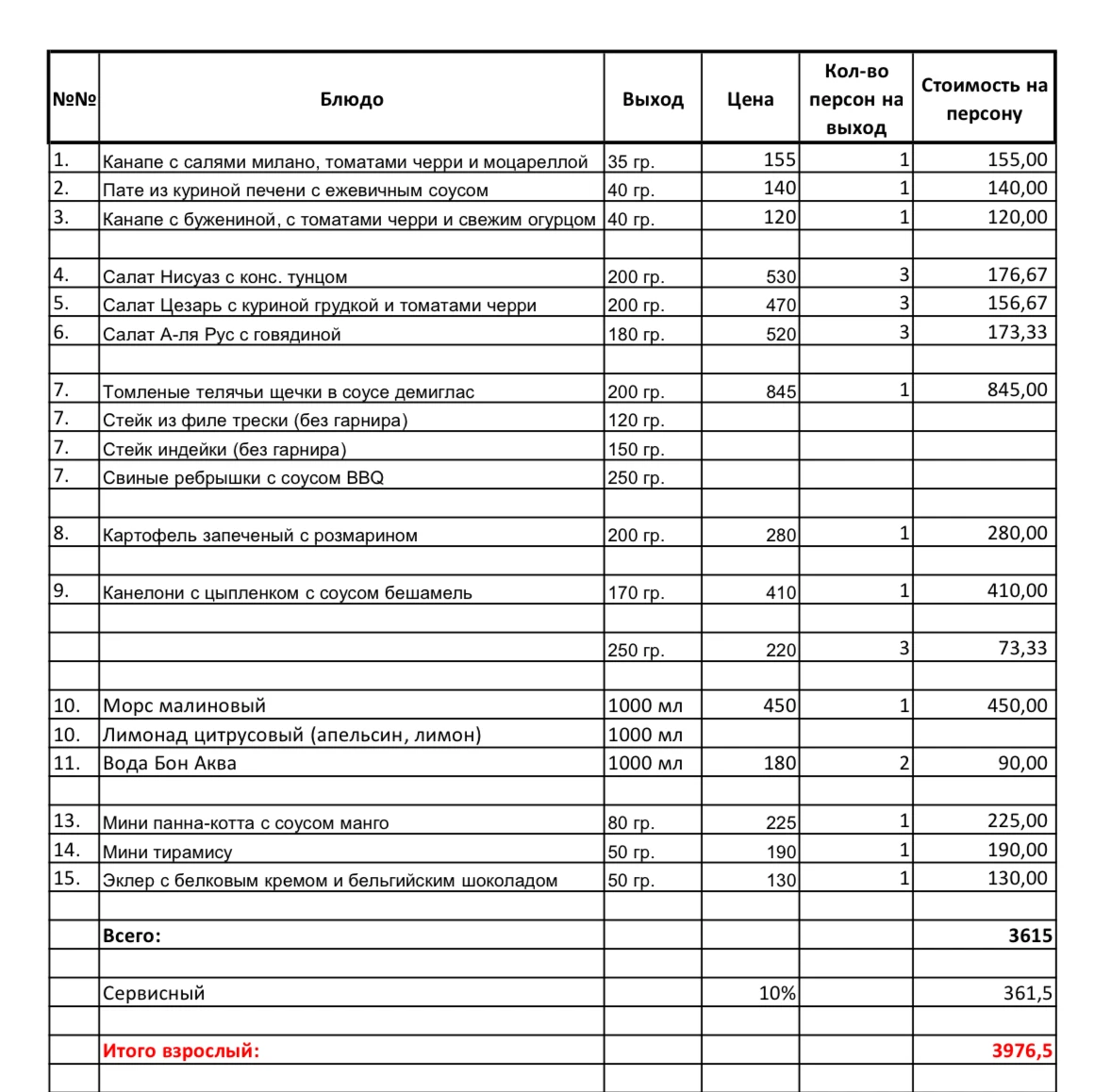 Далее по порции салата на 3 человека. Посмотрите выходы салатов - это каждому по ложке. Ни закусок ни нарезок нет. Позиции 7-8-9 это два горячих, вполне обычно хватает одного. 3 десерта тоже нафиг не нужны.