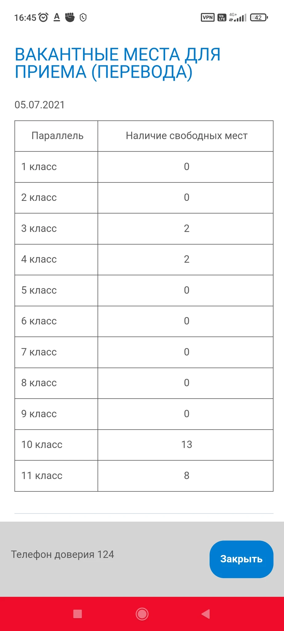 Повезло вам, из интереса посмотрела нашу школу, да , есть таблица со свободными местами за 2021год