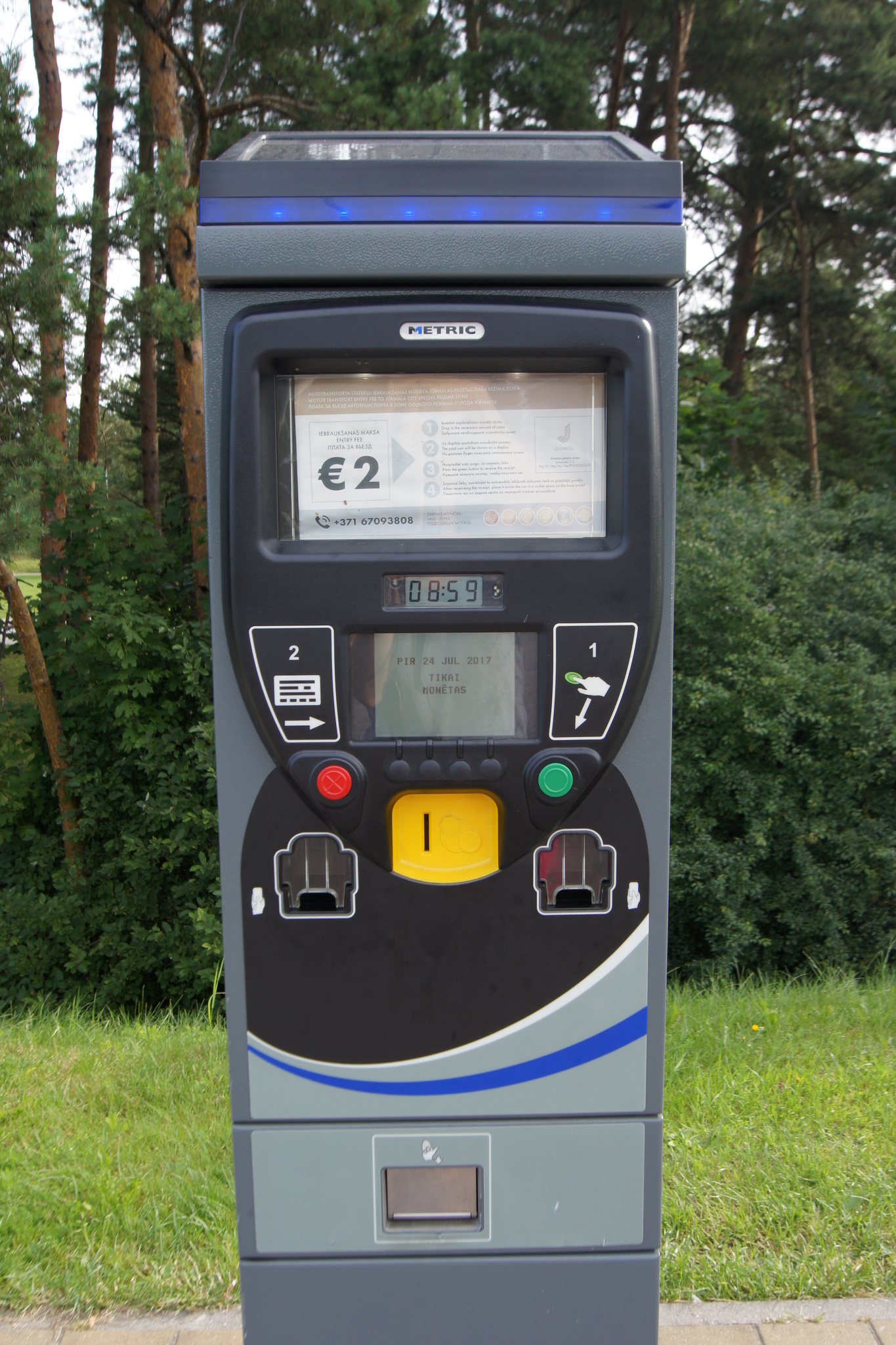 Въезд в Юрмалу - платный На въезде в город стоят вот такие аппараты: хочешь - картой, хочешь - монеткой, надо заплатить 2 евро и положить билетик под стекло. Этот билетик даёт право на въезд в город без ограничения времени пребывания там.
